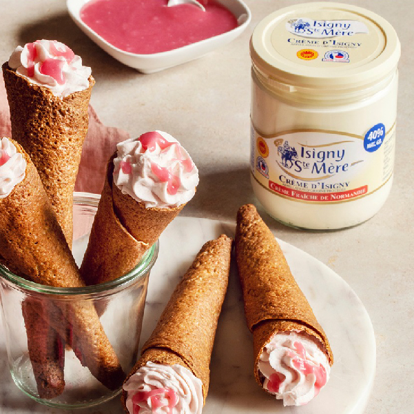 Isigny-sur-Mer is at the western end of the Bessin- France , is famous for its dairy products, and above all cremefraiche. Isigny butter and cream even hold an appellation d’origine controlee (AOC) . Butter , Cream , Cheese .