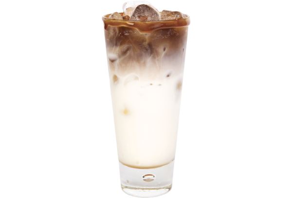 Pour the sauce into the bottom of the glass. Dispense the espresso and mix well with the sauce. Fill with ice cubes and pour in the milk. Finish with the flavoured whipped cream. Garnish and serve with a smile.