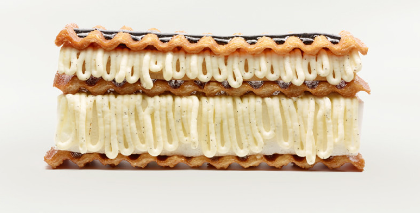 - Cut 20 cm x 2.3 cm strips, make an incision in the shape of a vanilla bean on one of the three strips necessary for assembling the millefeuille, then store in the freezer.