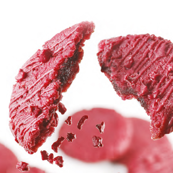 Freeze-dried raspberry crispy is covered with a film of cocoa butter that makes it resistant to moisture, allowing it to be used in yogurts, ice creams, or sauces without softening.