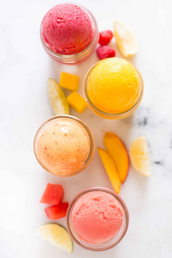 Measure the required quantity of mix sorbet. Melt the mix sorbet with the defrosted fruit purée. Measure the water and add it to the previous mixture. Mix and process in sorbet maker.